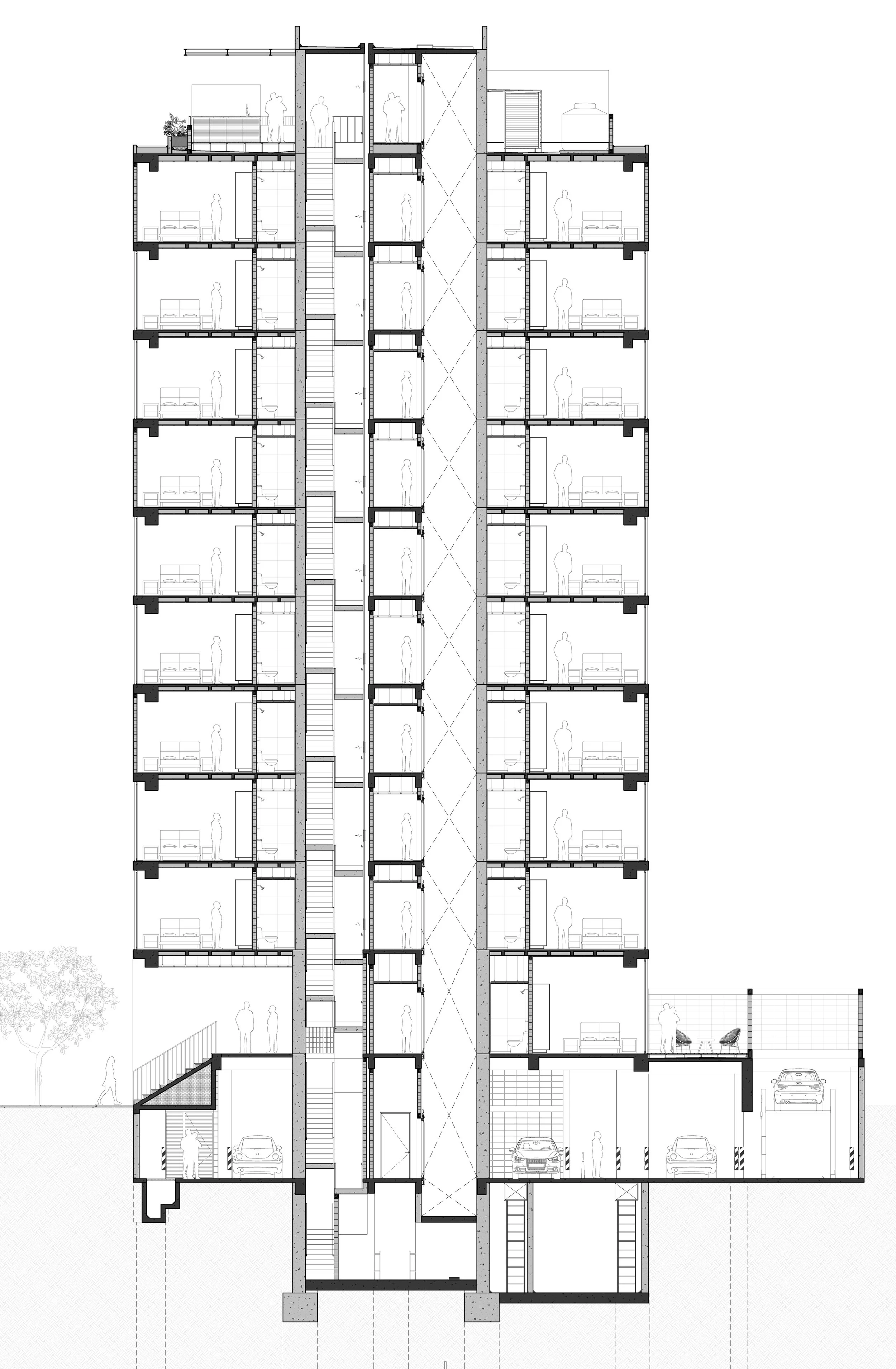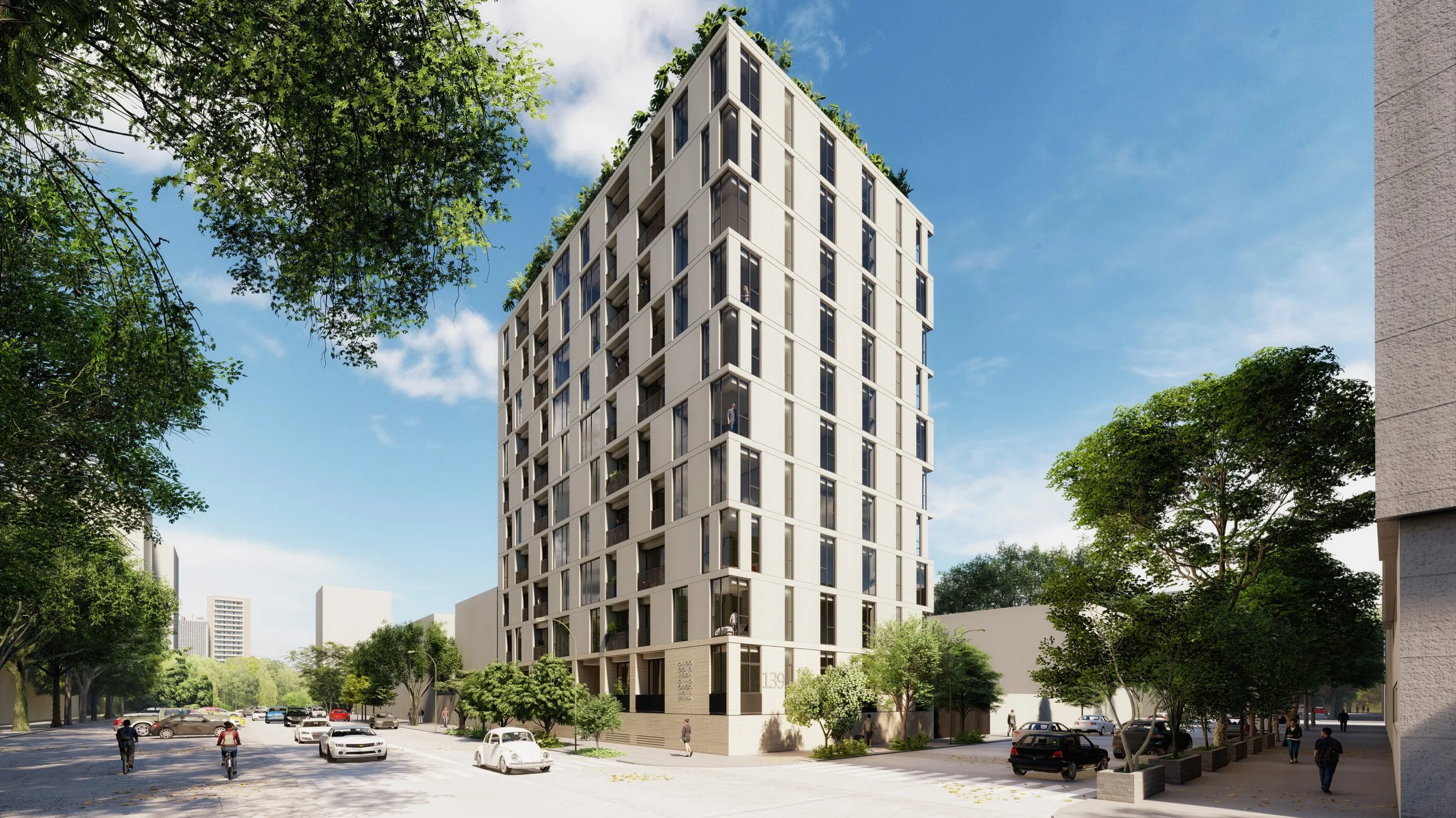 El concepto arquitectónico se centra en la síntesis del programa habitacional, reduciendo la complejidad de la vivienda a elementos esenciales que faciliten el acceso y la flexibilidad para un usuario que se desplaza por la ciudad. El programa arquitectónico se materializa en un volumen distribuido en 10 niveles sobre la banqueta, albergando 117 viviendas y un área de amenidades en la azotea, destinada a zonas de asadores, un invernadero, baños y espacios para el descanso, optimizando así el aprovechamiento integral de la cubierta.