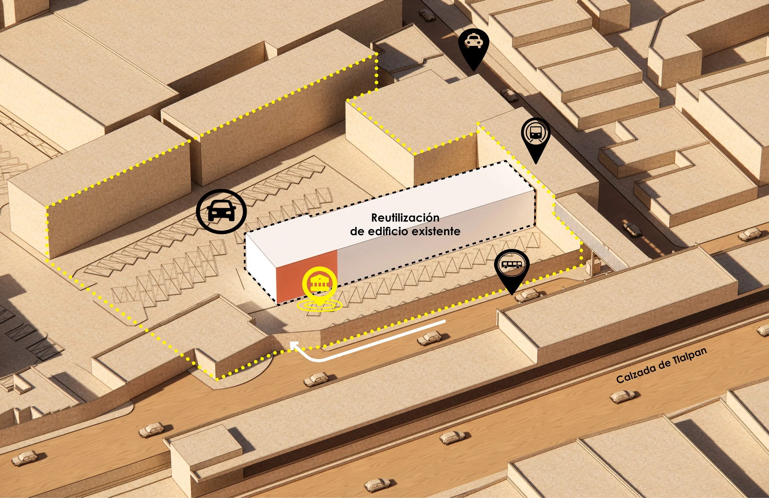 El concepto arquitectónico se basa en tres ejes fundamentales: eliminación de barreras, recuperación de estructuras existentes y expansión de espacios de convivencia. Se propuso una transición de un espacio cerrado y privado hacia uno de uso público, promoviendo la interacción social y el desarrollo económico local. Además, el proyecto contempló la conservación y exhibición del acervo artístico de la empresa, fortaleciendo su identidad cultural.